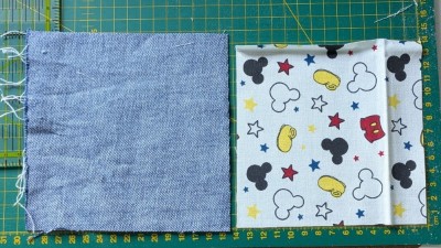 Cut 2 squares of fabric, mine were 15cm x 15cm. Leave the denim one as it is it but trim the other one (shown in mickey fabric) to be 14cmx14cm.