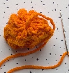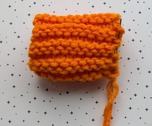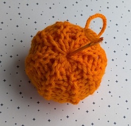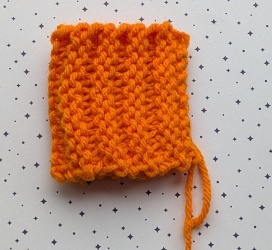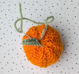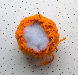 Cast on 7 stitches and then cast off these same stitches – so cast them on and immediately cast them off without working them. Leave a longish tail both ends for sewing. Follow the instructions below to sew and stuff the pumpkin.