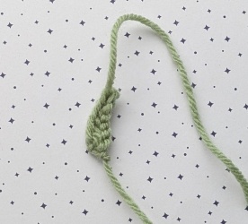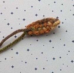 Stalk ready for sewing. Thread one of the tail ends and weave through the knitting to meet the other tail end. | Pull on the tail end slightly to give it a bit of a curl. | Now attach this to the top of the pumpkin. |