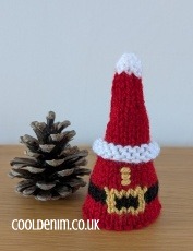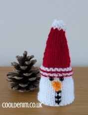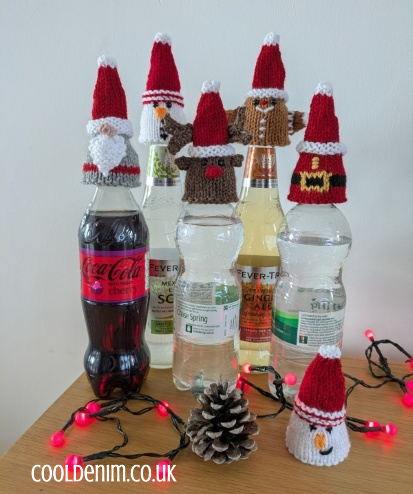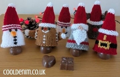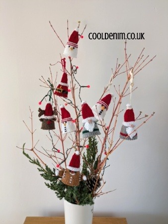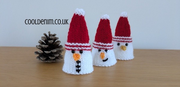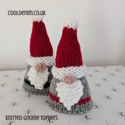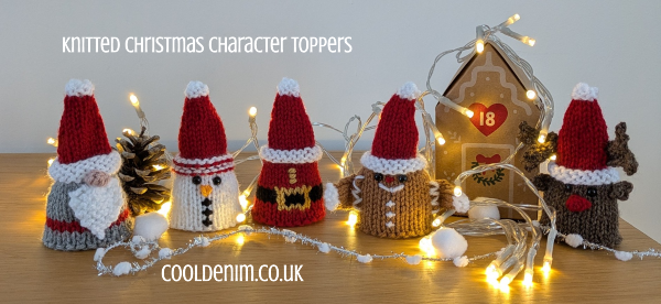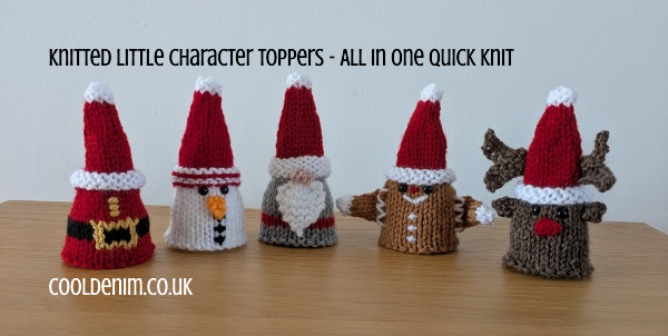 All in one little character knits creating useful decorations. These toppers are knit in one piece, features added and then seamed, no separate hats. They don’t need any stuffing as they stand up by themselves, they are hollow so you can hide small sweets or chocolates underneath, hang them from a tree or just simply stand them. I have designed them to be an easy knit and the pattern includes a full tutorial on how to create the decorations shown in the images, you can then choose how you display your finished characters.