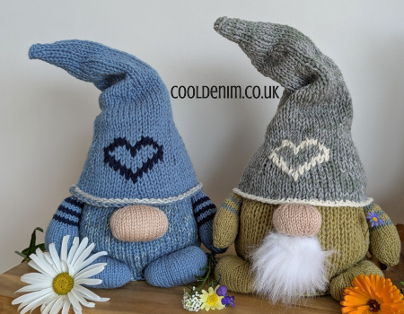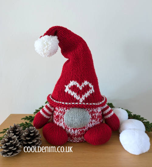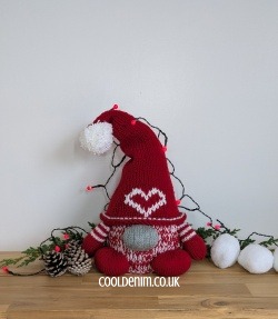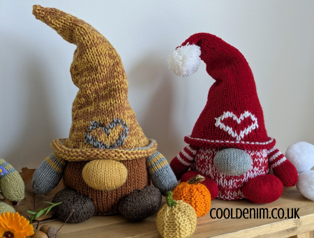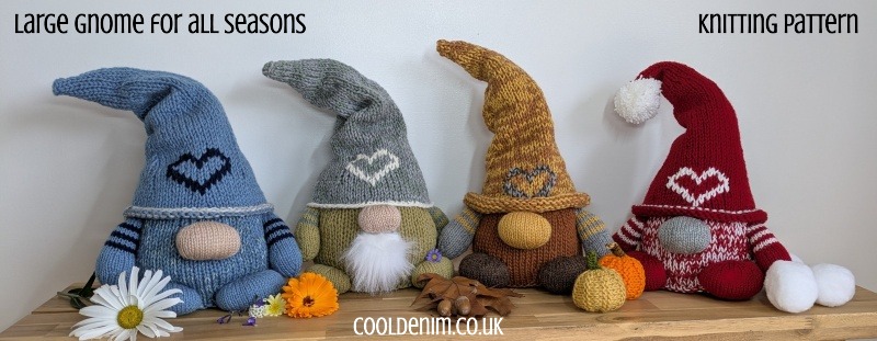 Large gnome for all Seasons, Knit yourself a decorative gnome whatever the weather and whichever the season…. the gnome is sure to get a smile! This ones a proper stash buster and a bit larger than my normal patterns, I wanted the gnome to be a talking piece for you to make seasonal arrangements using the gnome as the centre piece. The seasonal images in this post will hopefully give you even more inspiration to knit one for your home in your favourite colours.